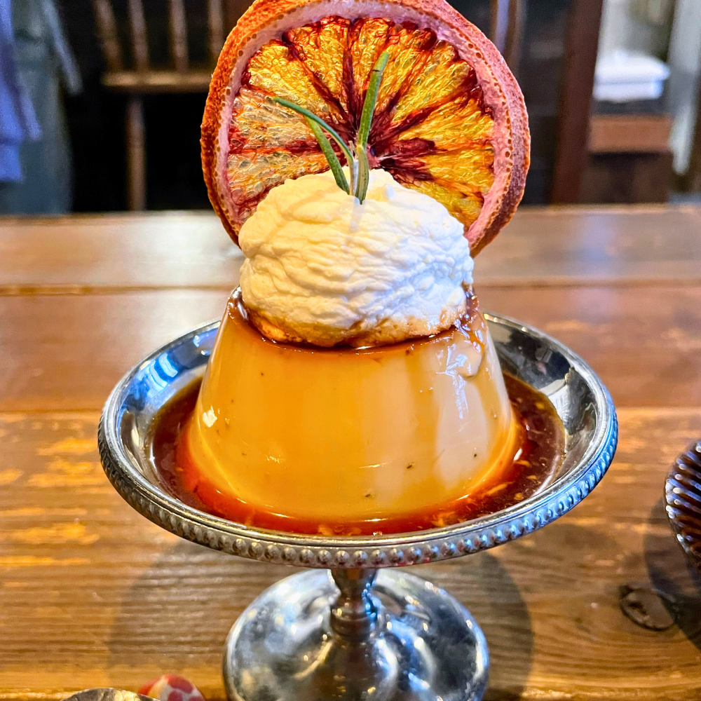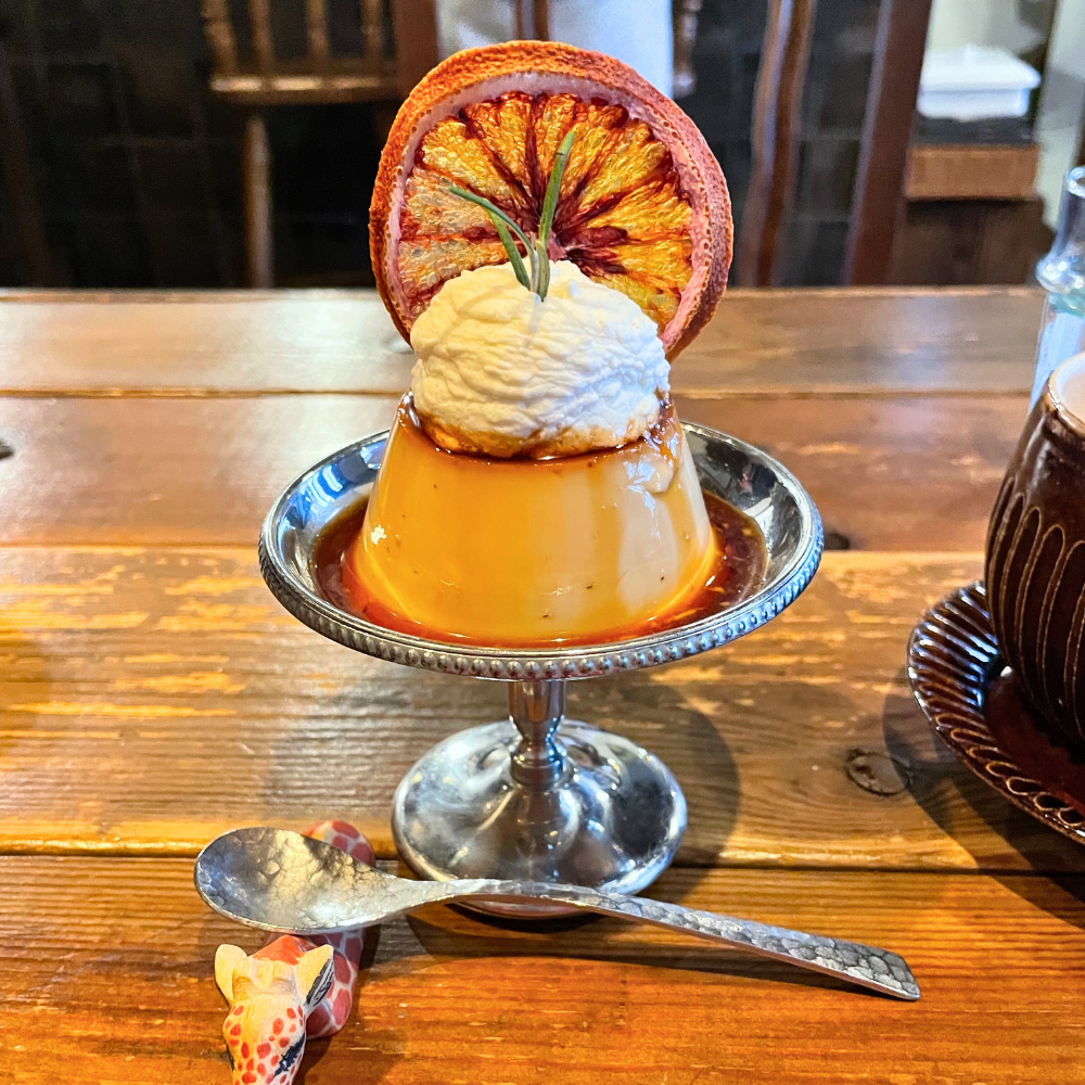 アールグレイの香り豊かなプリンの上にドライフルーツのブラッドオレンジ輪切りが大胆に飾られた、美しいビジュアルの一皿です。